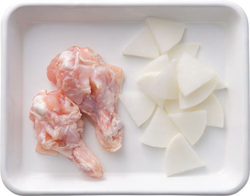 大根は厚さ5mmのいちょう切りにする。鶏手羽元の皮にキッチンバサミか包丁で数カ所切り込みを入れる。