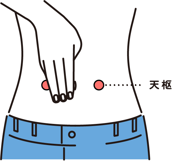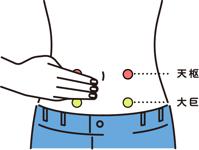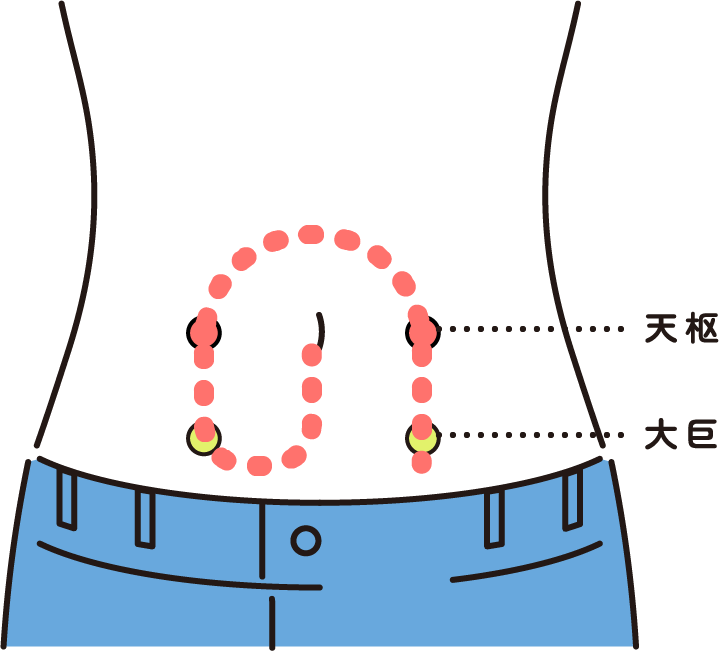 お腹には、天枢(てんすう)・大巨(だいご)といった、便通を整えるとされるツボがあります。これらのツボを意識して、お腹の「の」の字マッサージをしてみましょう。