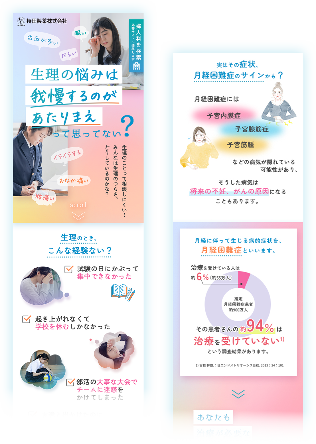 多くの女性が抱える生理の悩みやつらさ。こうした悩みを『我慢するのがあたりまえ』になりがちな若い世代に向けて、婦人科受診啓発ページを作成し、SNSを通じた配信を開始しました。